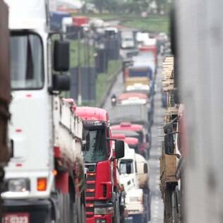 Fila quilométrica de caminhões à espera para descarregar mercadorias no porto de Santos, na rodovia Cônego Domênico Rangoni